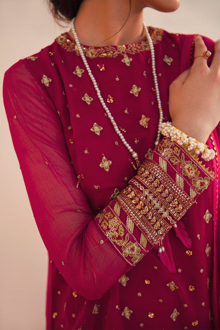 - DESCRIPTION:Crafted with chiffon in front, plain chiffon in the back, and embroidered organza neckline patch, this OF-394 design displays embroidered chiffon sleeves with an embroidered organza sleeve border and an embroidered organza dupatta. Accompanying these elements is a dyed silk trouser.