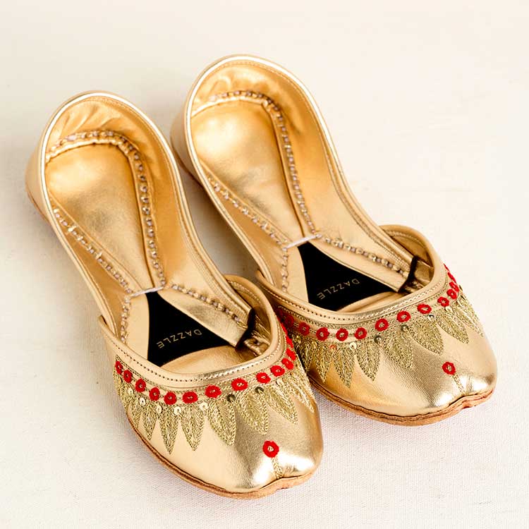 “shabrooz” Shines In A Radiant Golden Tone, Beautifully Enhanced With Intricate Embroidery And Striking Red Bead Accents Along The Upper. Its Gleaming Finish And Detailed Craftsmanship Make It A Perfect Statement Pair For Festive Celebrations And Special Occasions.