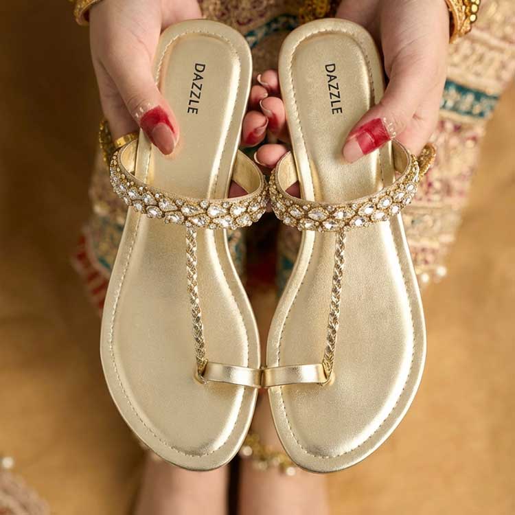 Chic Gold-tone Kolhapuri-style Sandals Featuring Delicate Chain Detailing And Subtle Crystal Accents. Elegant Yet Comfortable, These Flats Add A Modern Festive Touch To Both Ethnic And Fusion Outfits.