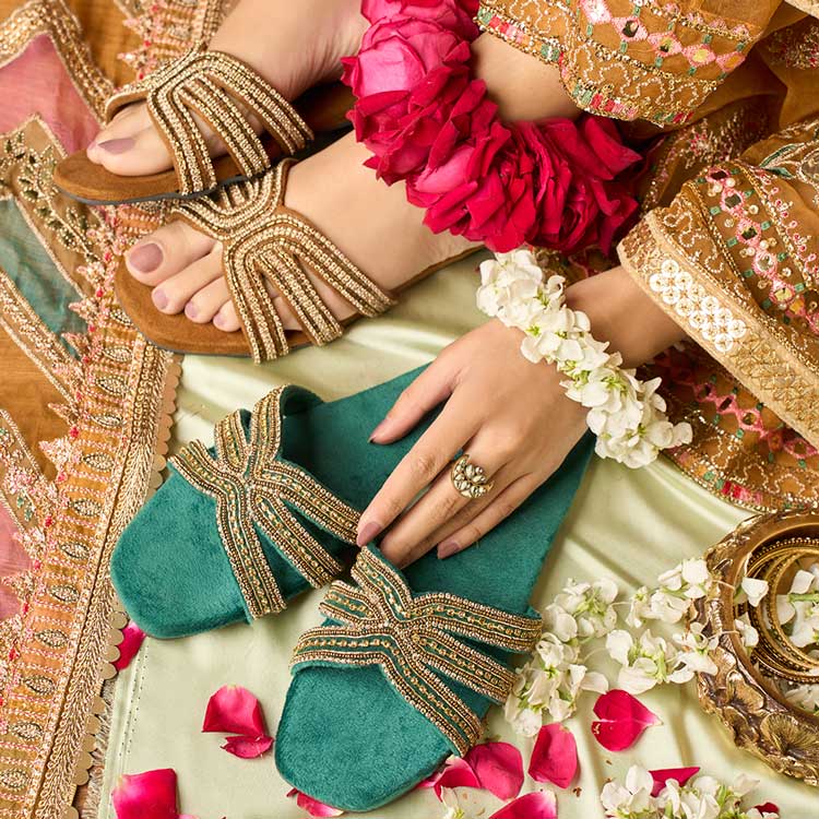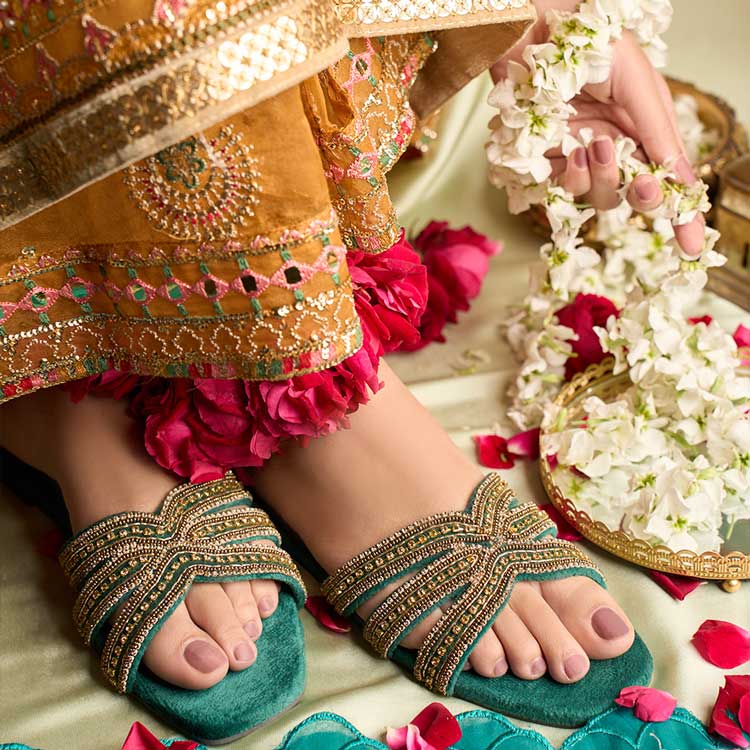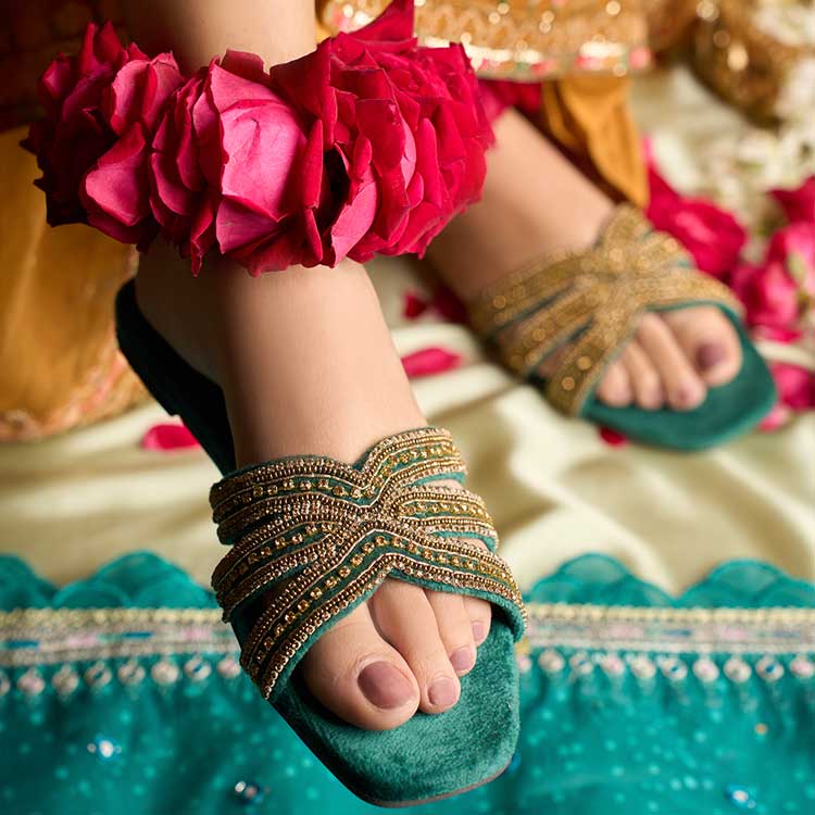 Make a statement with these gorgeous beaded shamroza sliders in emerald green. These are ideal for giving your ensemble a regal feel because of the glistening gold beading set against the rich green backdrop.