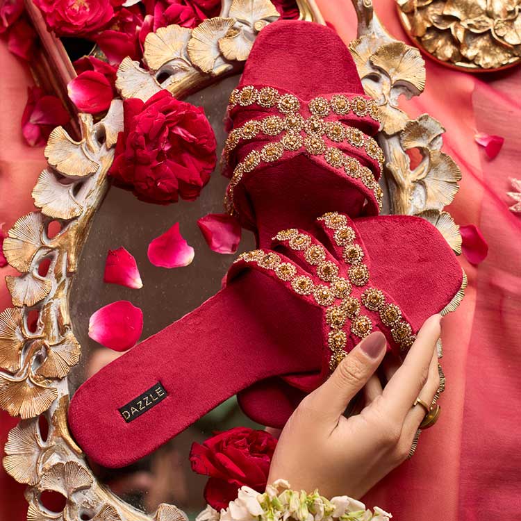 Give your outfit a splash of color with these gorgeous maroon beaded “Zeba” sliders. The velvet sole offers unparalleled comfort, while the elaborate beading on the upper emphasizes the glam factor.