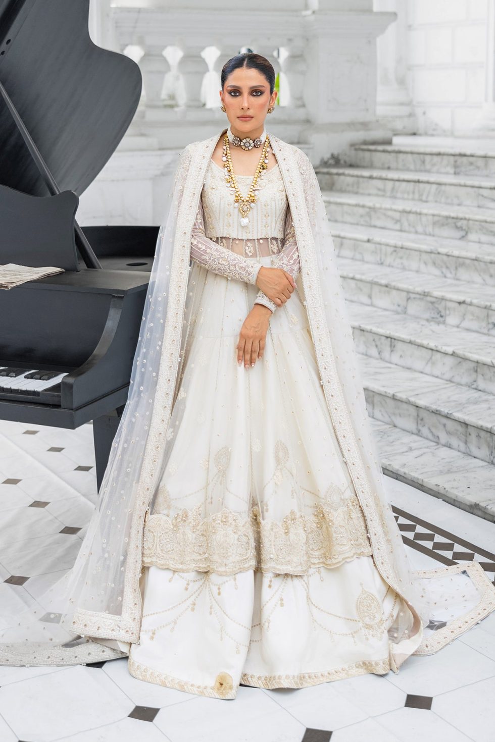 The outfit is a stunning white pishwas paired with a matching embroidered lehenga. The Lehnga is adorned with delicate gold thread work, adding a touch of luxury and sophistication, creating a cohesive and harmonious look. The white and gold color combination gives the outfit a regal and elegant appearance, perfect for formal events.