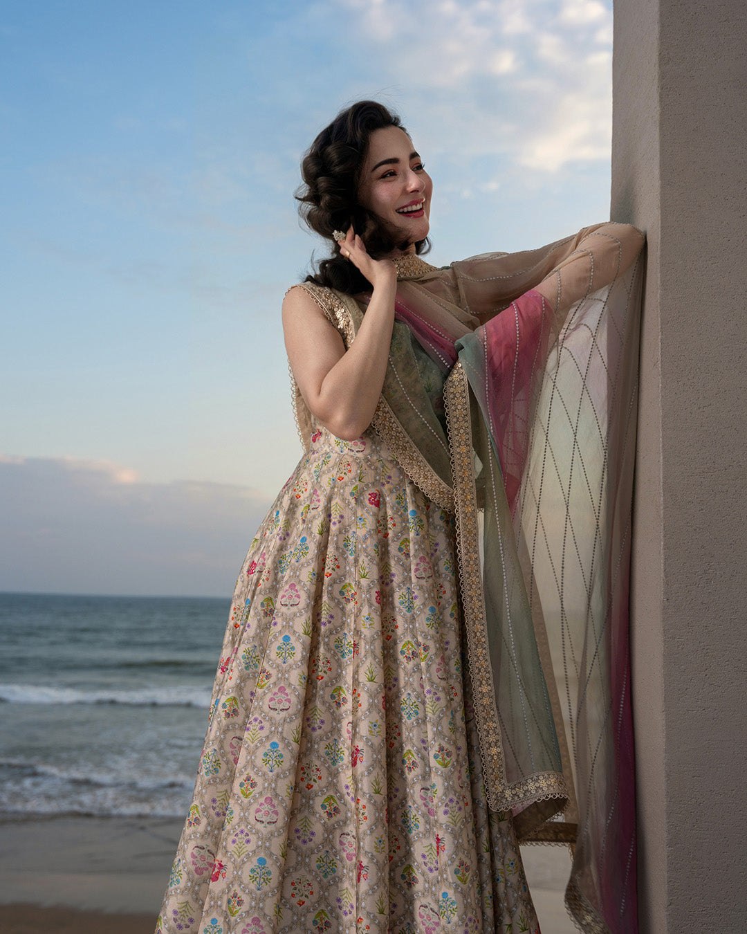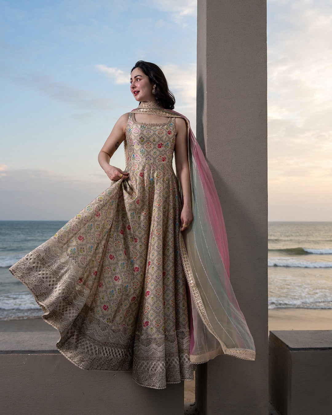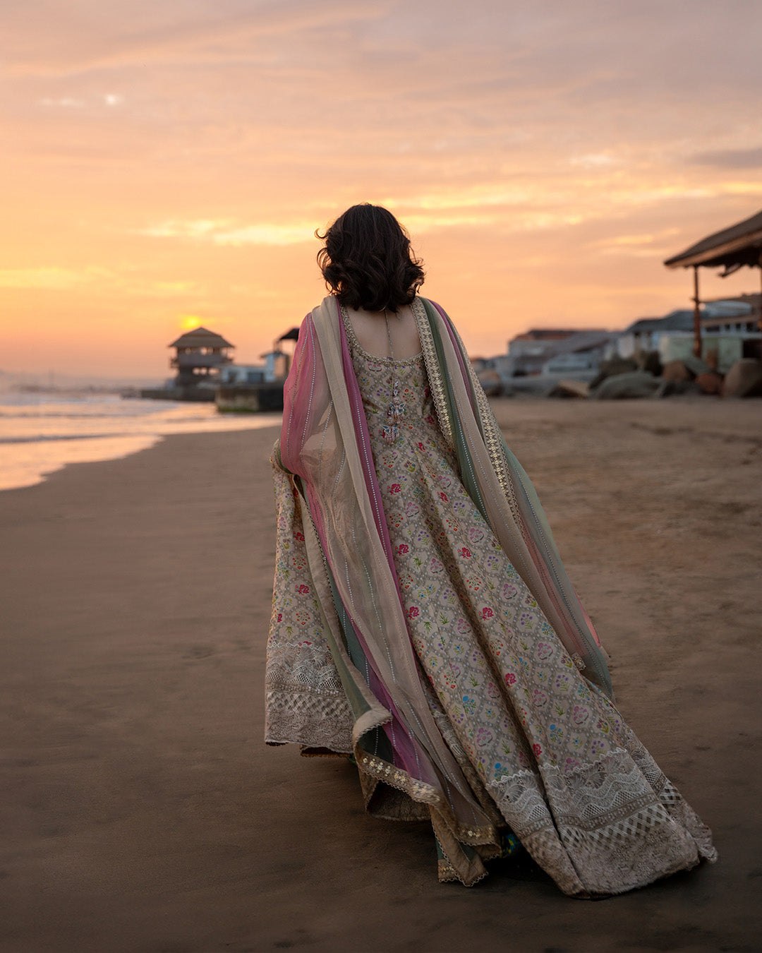 Embodying Grace, Naavah Is An Exquisite Classic. Crafted From Luxe Silk On A Beautiful Beige And Multi-hued Canvas, The Embellished And Embroidered Pishwas Showcases Artistically Arranged Sequin And Moti Patterns. Paired With A Silk Churidar And An Embroidered Chiffon Dupatta, This Piece Is A Truly Versatile Number That You Will Cherish For Years.