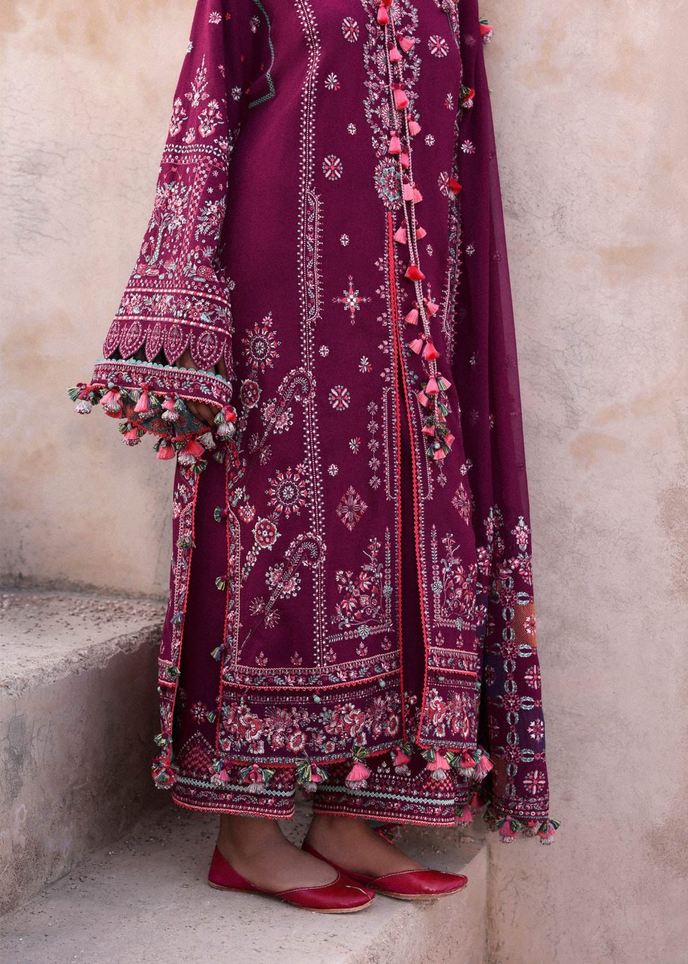 A magenta embroidered karandi front-open shirt adorned with rich, colorful embroidery on the neck and hem, paired with beautifully detailed embroidered sleeves for that extra charm. Styled with embroidered culottes and a chiffone embroidered shawl, enhanced further with patched karandi pallu featuring chic color-blocking and jall detailing — every element speaks luxury and tradition.