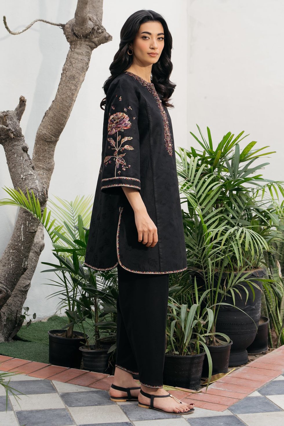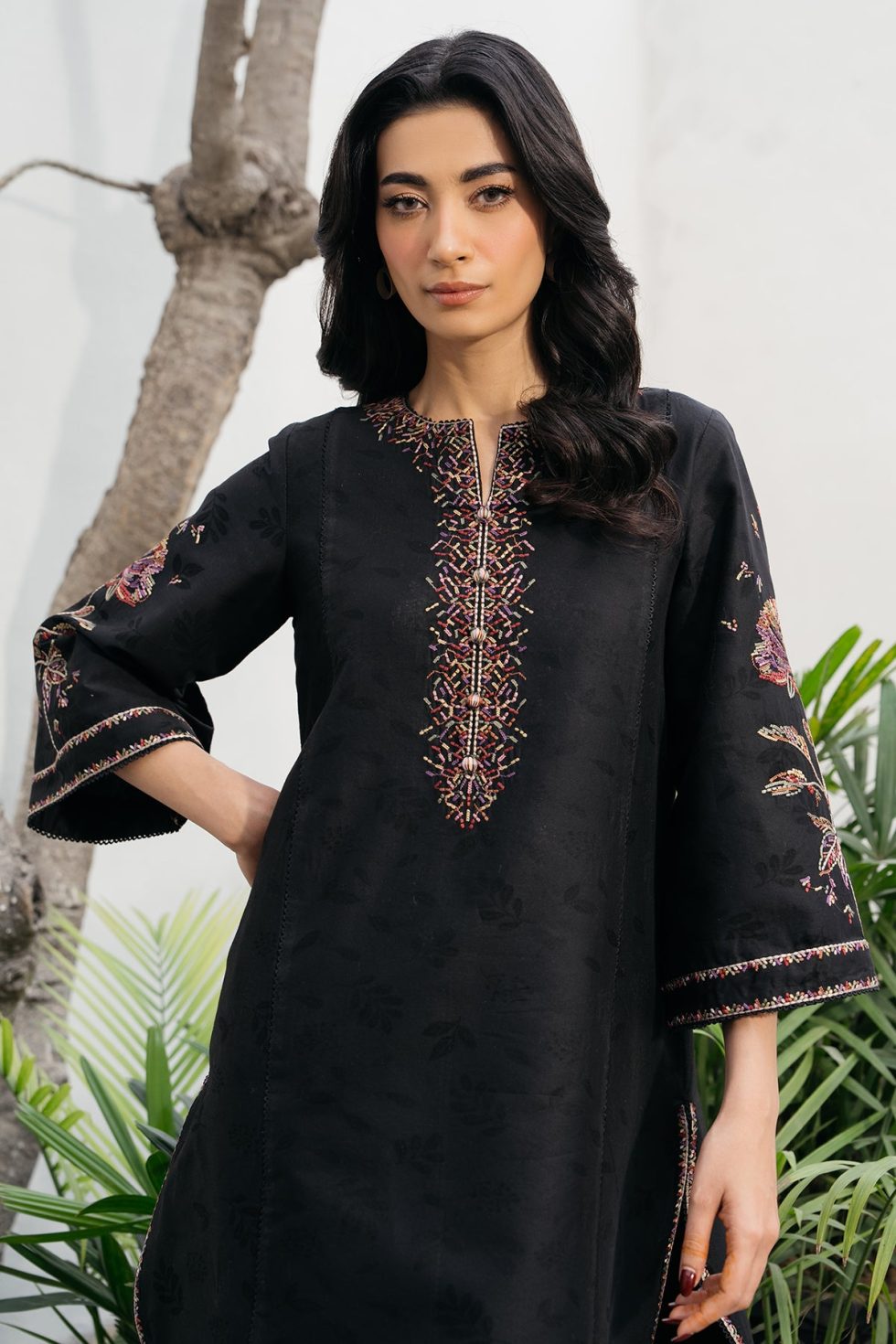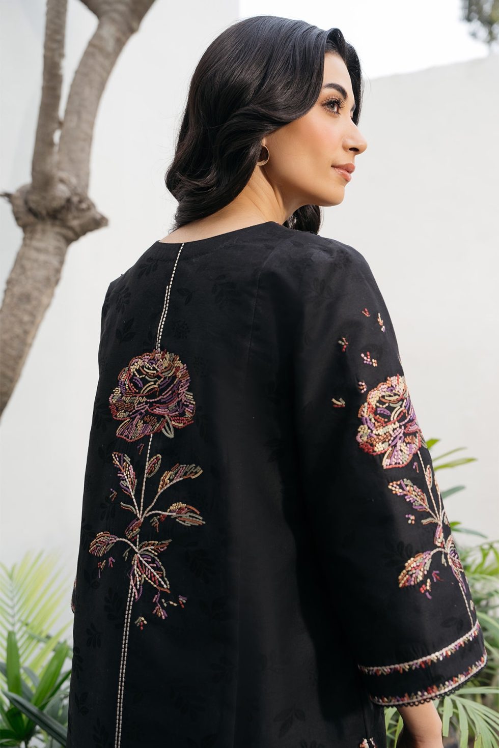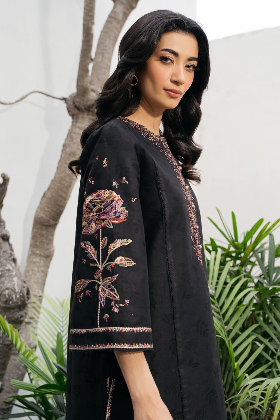 This exquisite embroidered jacquard lawn ensemble features detailed embroidery on the front, back, and sleeves, showcasing intricate craftsmanship. The design extends to the bottom border, enhancing its elegance. Paired with a dyed cambric bottom, this ready-to-wear outfit offers both comfort and sophistication, perfect for refined occasions.