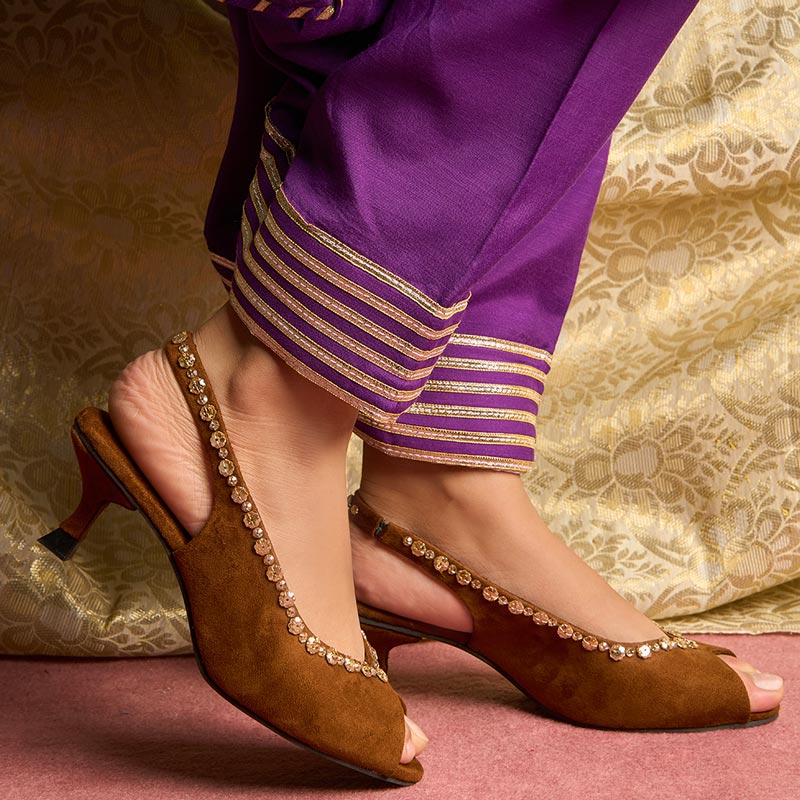 The copper suede peep toe heel design is instructed with gems. Its lined with a luxurious base to give a statement. The minimal yet impactful design makes it a piece of art and a great fit for all festive occasions.