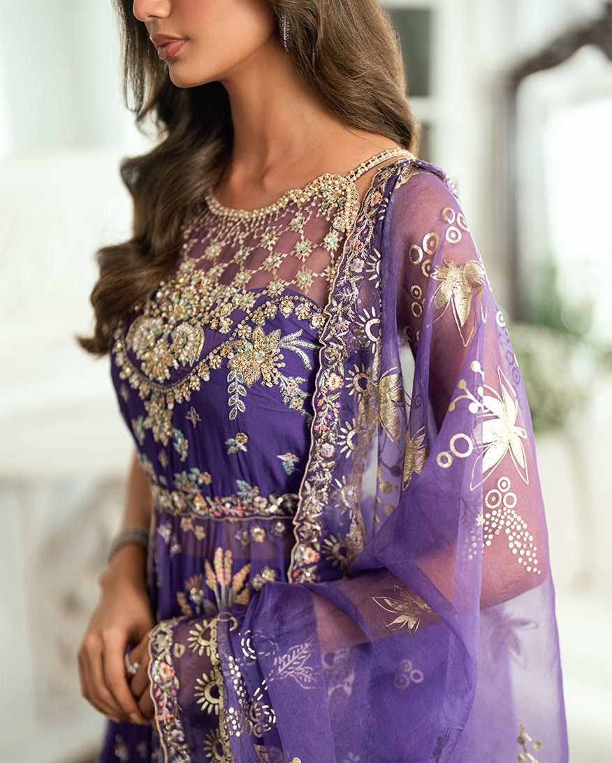 • Embroidered, sequinned pearl embellished front daman border (organza)