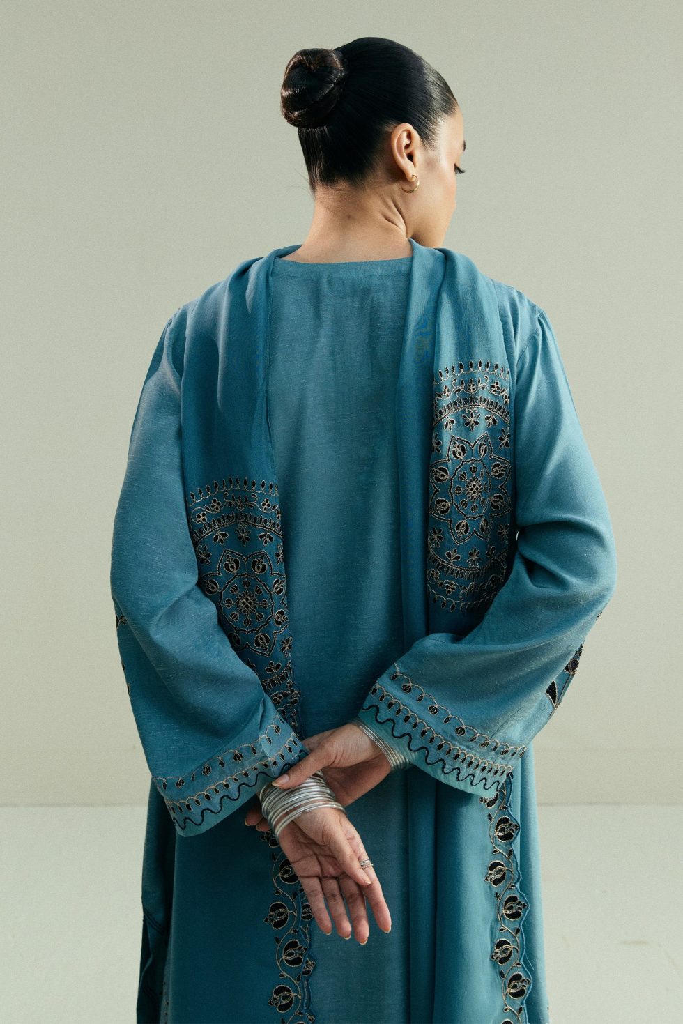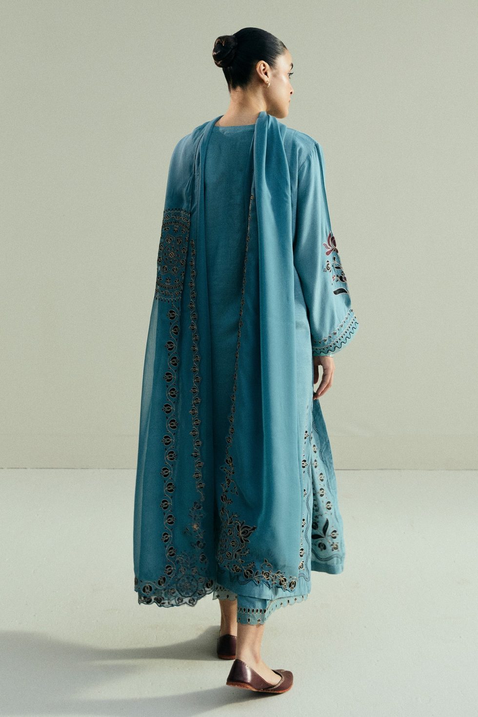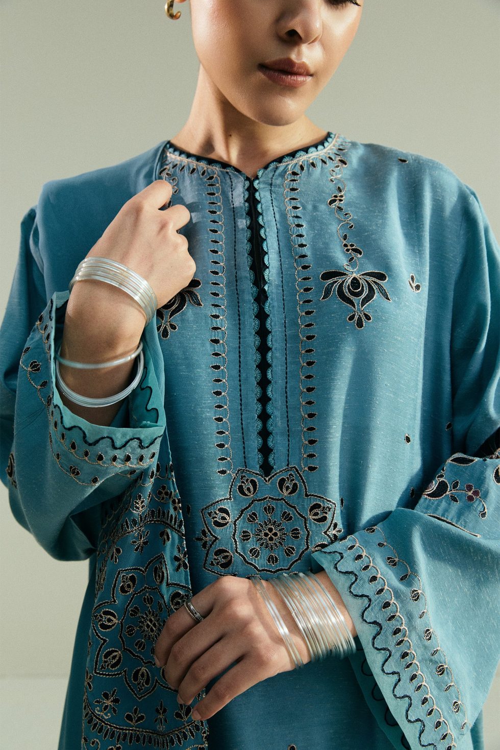 This loose-fit blue kameez features a classic embroidery layout that lends it a timeless appeal. It is paired with cropped straight pants, detailed with embroidery that echoes the shirt’s design. The look is finished with an asymmetrical embroidered dupatta, adding a modern twist to the traditional silhouette.