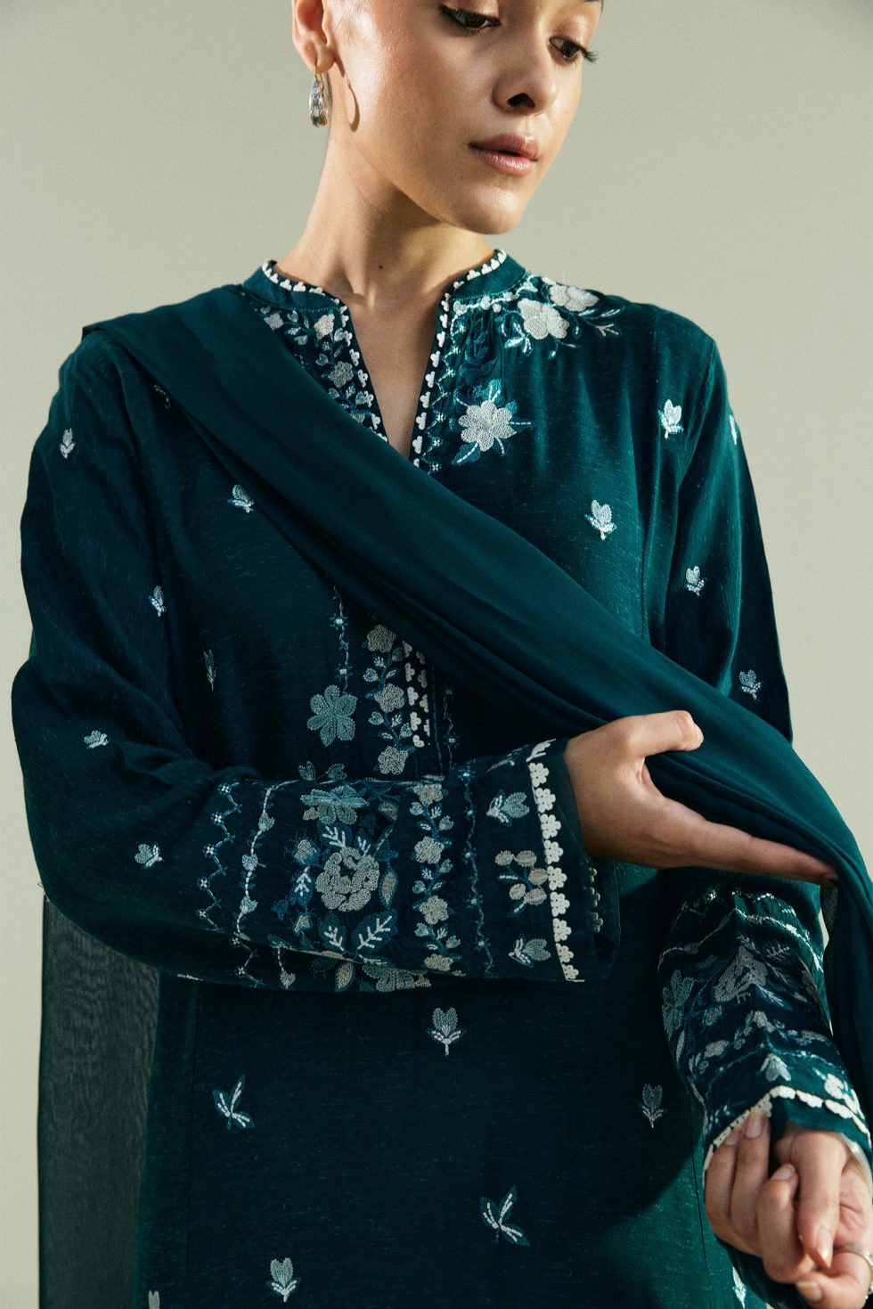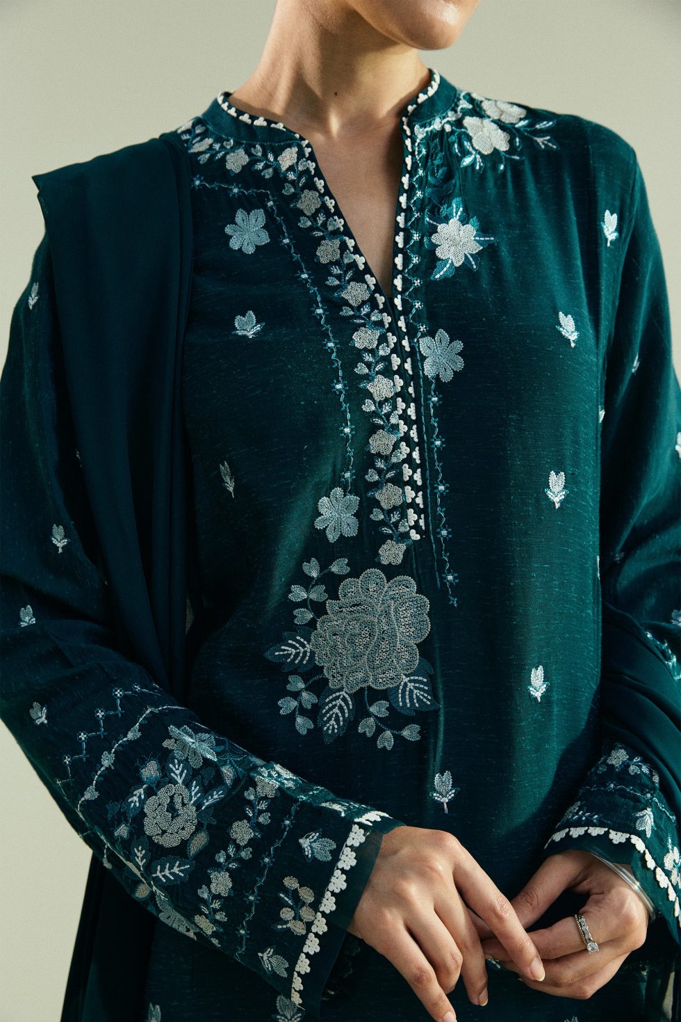 This classic navy blue long kurta is accented with bold cross-stitch embroidery in striking hues of teal and white, bringing a vivid contrast to its clean silhouette. It is paired with tonal culottes that keep the look balanced and refined. A matching dupatta completes the outfit, adding cohesion and understated elegance.