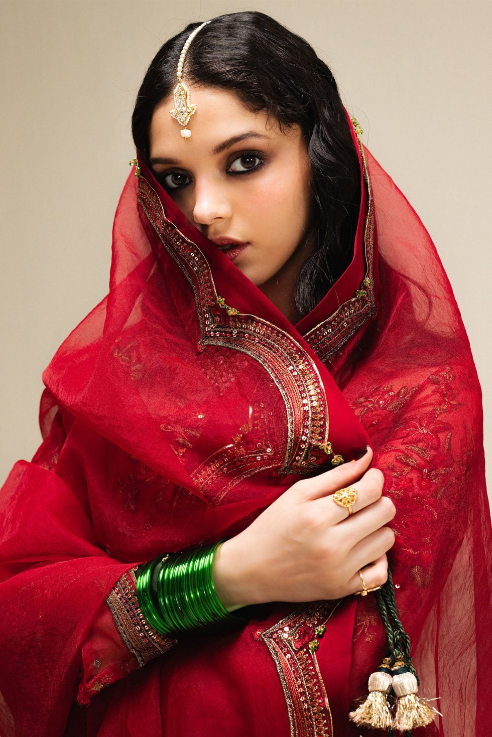 A striking red organza Anarkali, delicately embroidered with scattered rose motifs in shades of red and green. The fitted sleeves and hem are finished with a deep green silk border and scalloped edging, adding a graceful contrast. It is paired with a red Korean silk lehenga adorned with a zig-zag gota pattern for that perfect look.